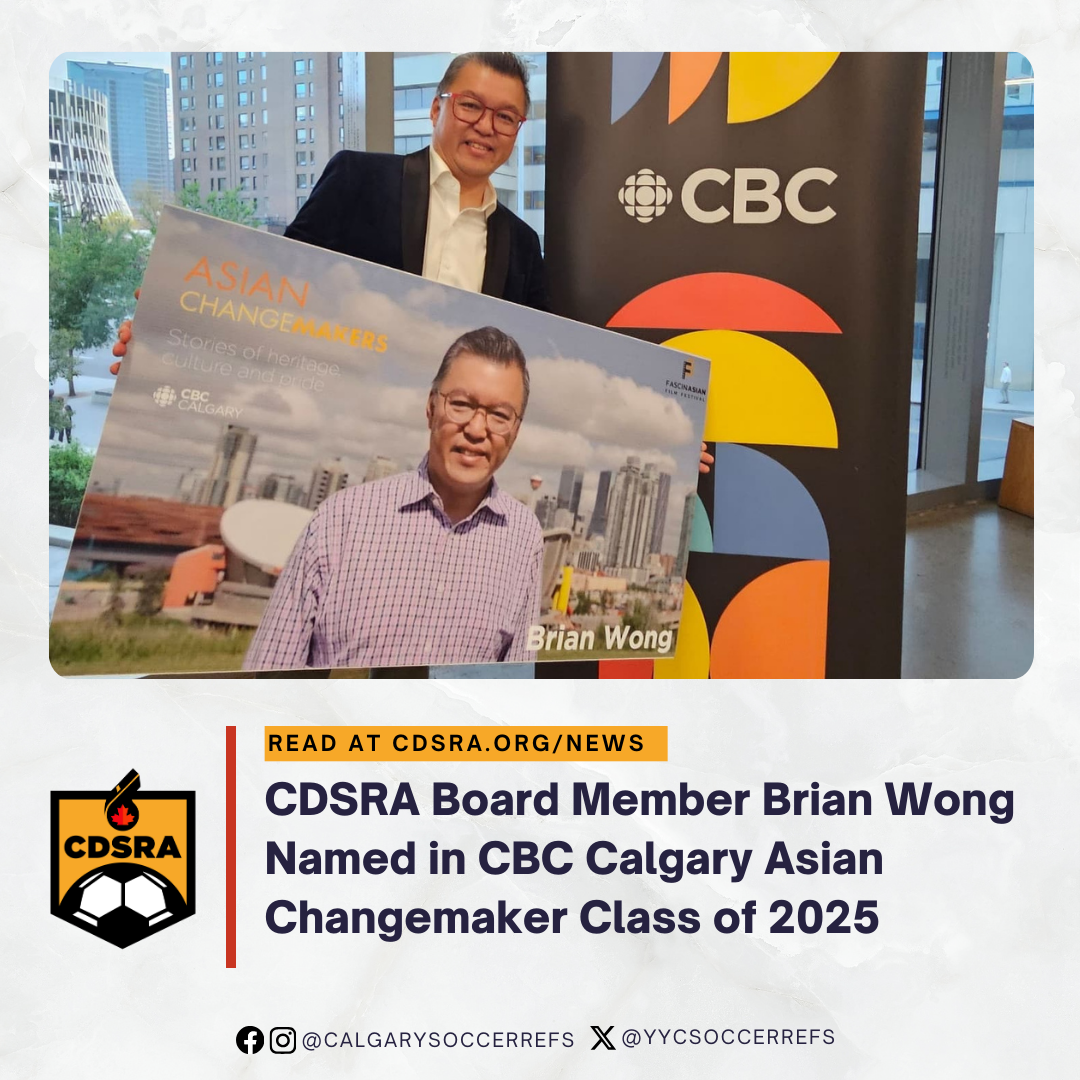 The Calgary District Soccer Referees Association (CDSRA) is proud to congratulate Brian Wong, an appointed Director serving on the CDSRA Board of Directors, on being named in the CBC Calgary Asian Changemaker Class of 2025.